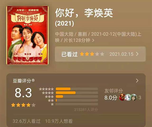 贾玲首次担任导演的影片《你好,李焕英》,堪称口碑、票房双赢。  截至目前为止,豆瓣评分8.3,位列同档 ...