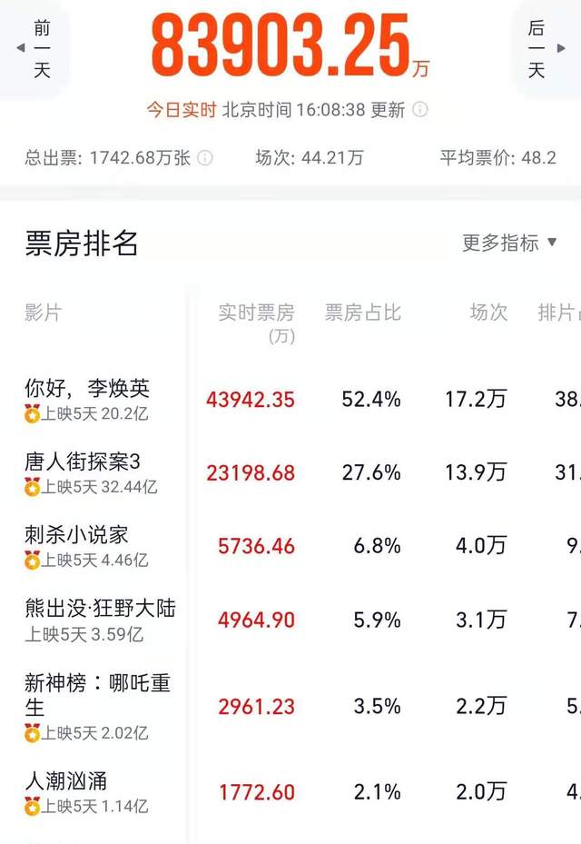 截至目前为止,豆瓣评分8.3,位列同档期影片榜首。票房方面,则已经突破20亿。单日票房更是反超《唐人街探案3》,冲到了冠军位置。